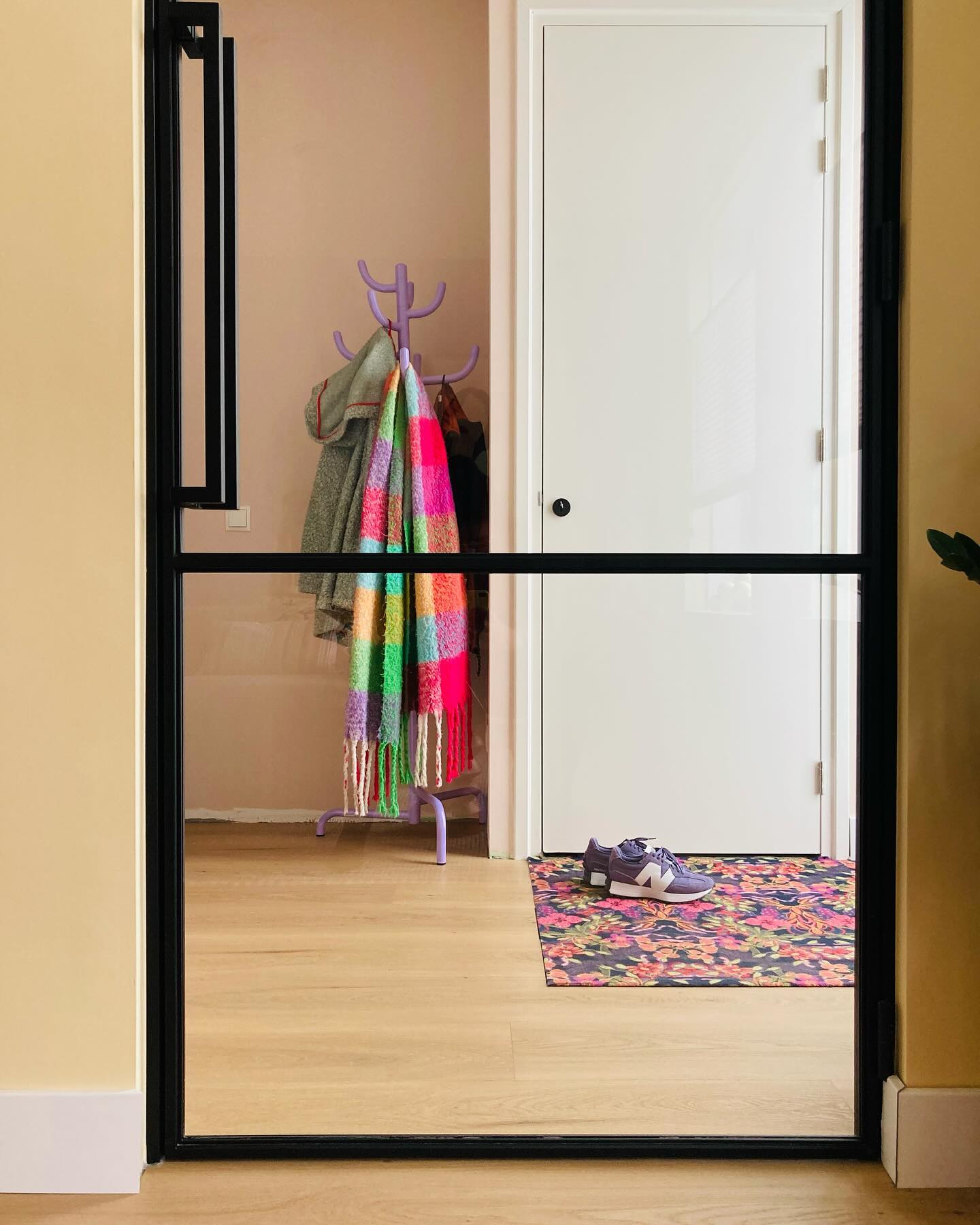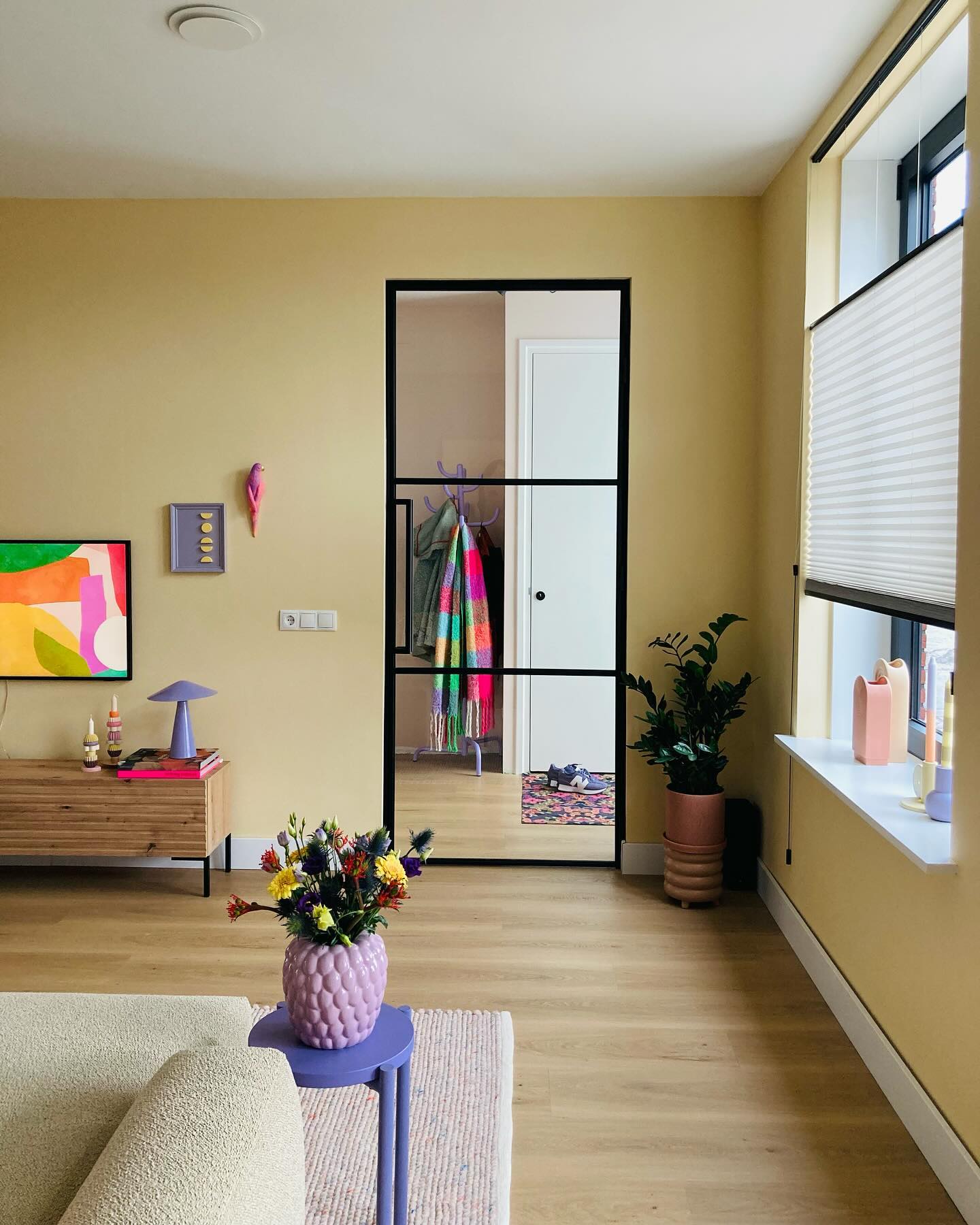 Hoe deze Loftdeur de inkom van mijn zachte pastelkleurige woonkamer verrijkt als je er binnenstapt, is immens. De dunne strakke zwarte lijnen van de deur met de andere minimalistische zwarte elementen in mijn interieur sluiten naadloos op elkaar aan en blende tot een fijn, sfeervol en vooral kleurrijk geheel.