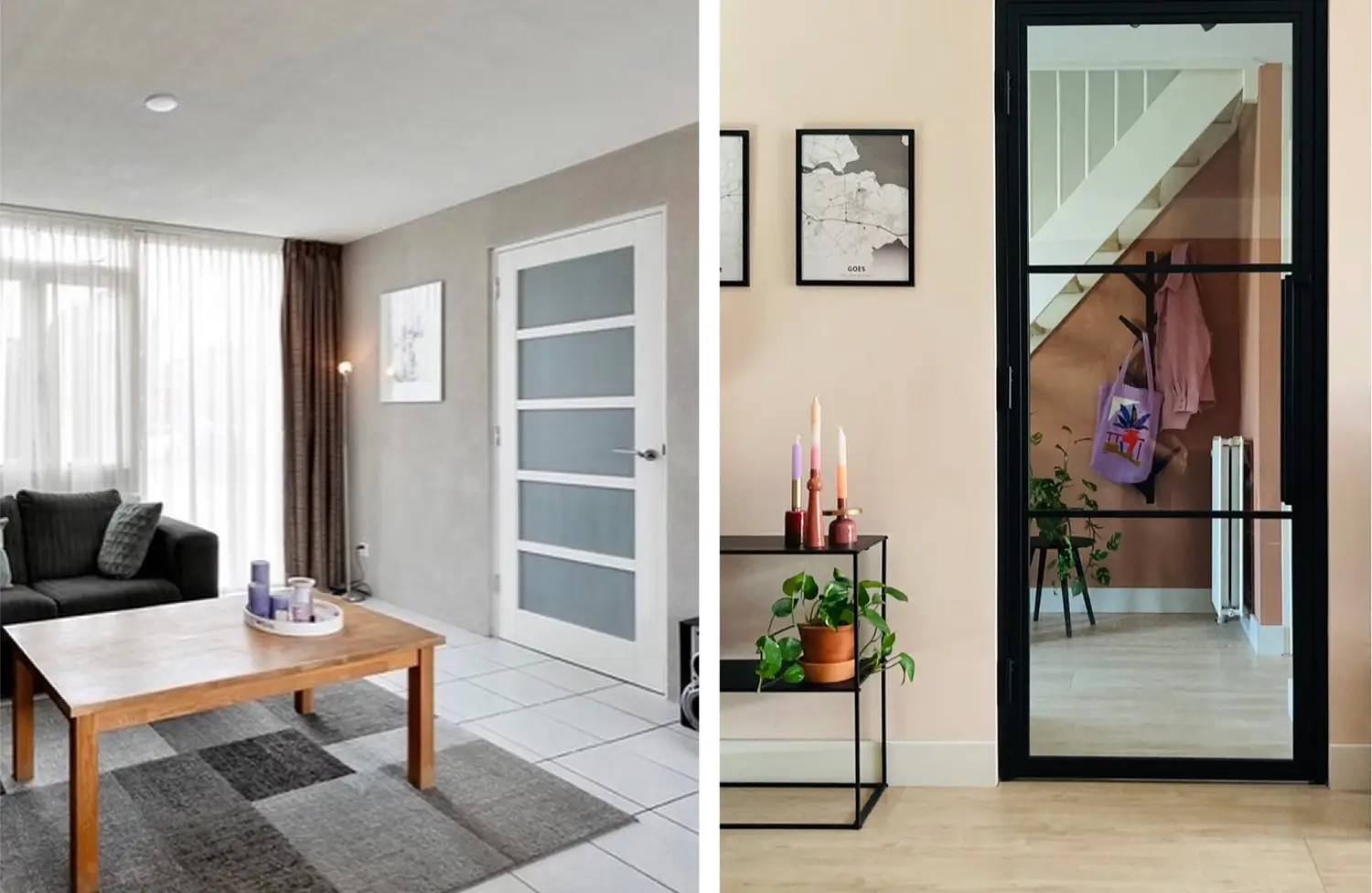 Toen mijn partner en ik ons eerste koophuis gingen opknappen en inrichten, moesten we concessies doen en slim met geld omgaan. Toch wilden we een zo’n luxe mogelijke uitstraling creëren. Een mix van zwarte meubelen en een zwarte keuken, met kleur op de muren en in de accessoires was het idee. En daarbij stond de keuze voor een stalen deur vast.